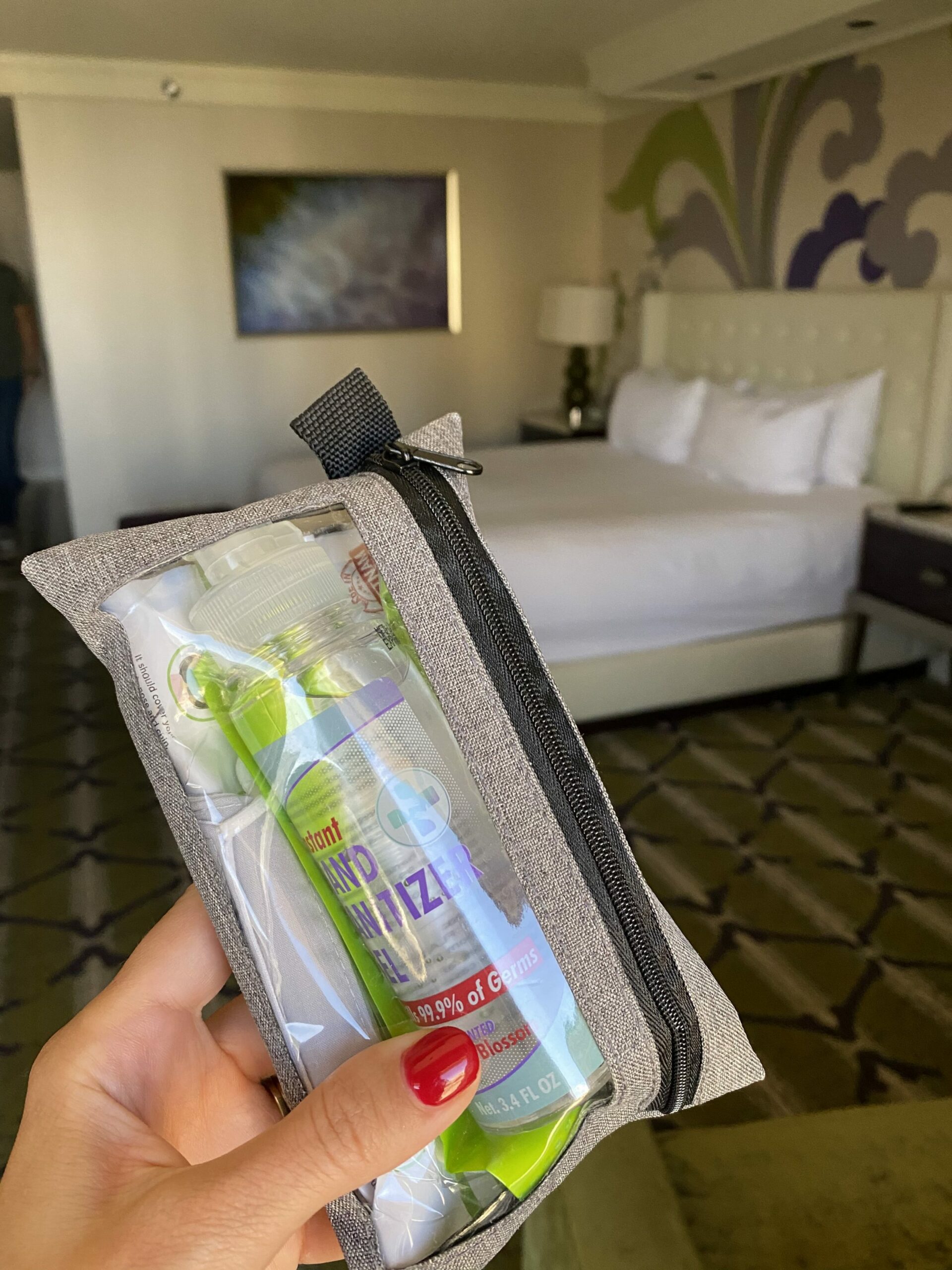 (A welcome bag in our room with masks, hand sanitizer, cleaning wipes, and a door opener)