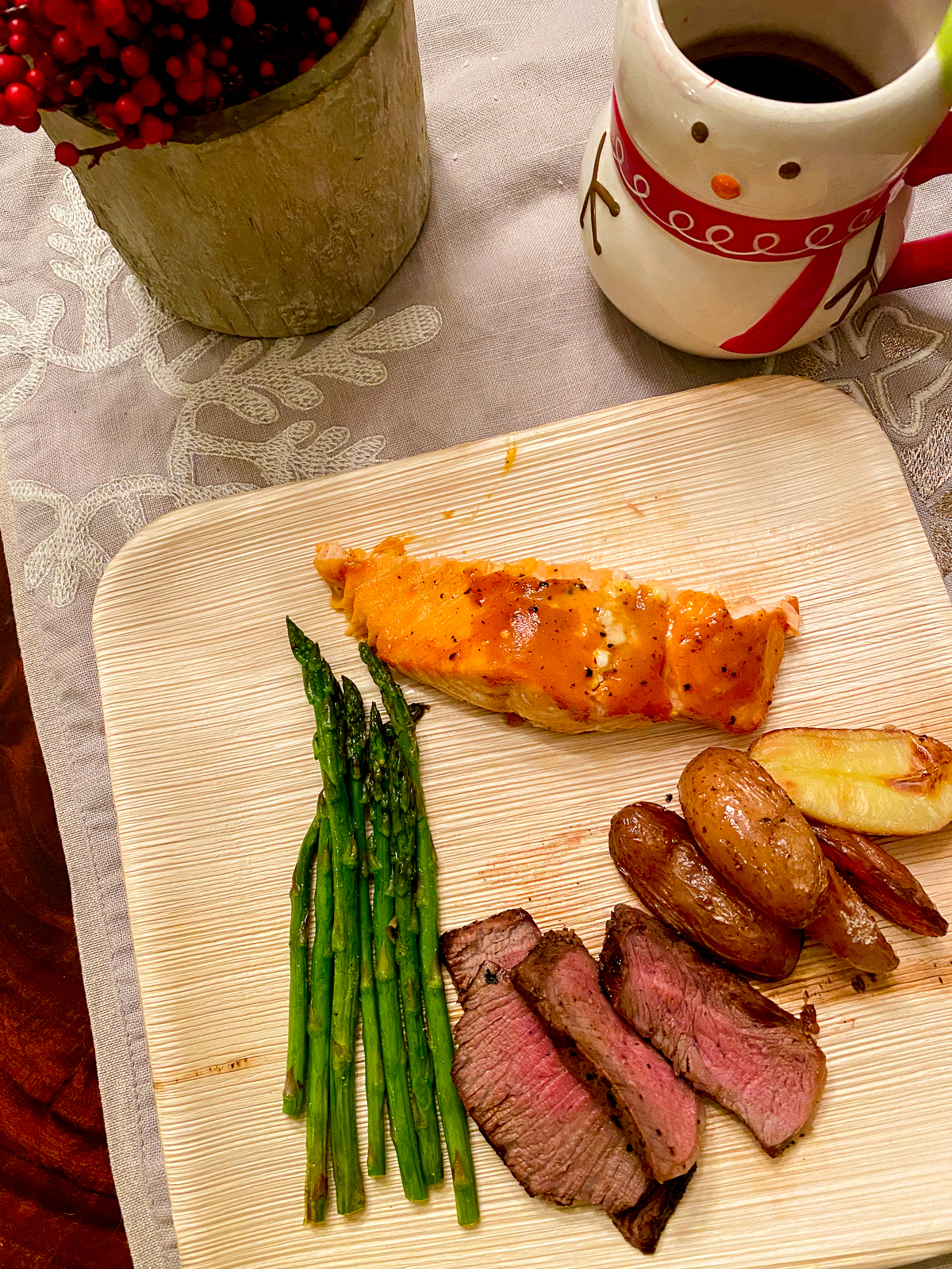 The kids spent the afternoon playing with their toys and we sat around eating sweets and watching movies. I caught a quick ride on the Peloton and we made dinner: roasted lemon and garlic asparagus, steak (a mix of NY strip and filet mignon), BBQ salmon, roasted potatoes, and mulled wine in the slow cooker.